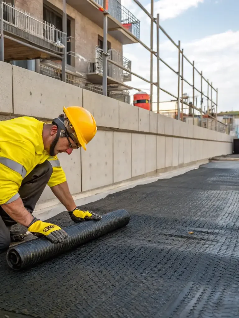A commercial building under construction, highlighting the application of a waterproofing system to the foundation and external walls. The image should emphasize the scale and complexity of commercial projects.
